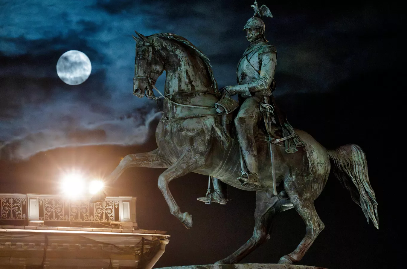"القمر العملاق" في خلفية النصب التذكاري لنيكولاس الأول في ساحة القديس إسحاق، بمدينة سانت بطرسبورغ الروسية