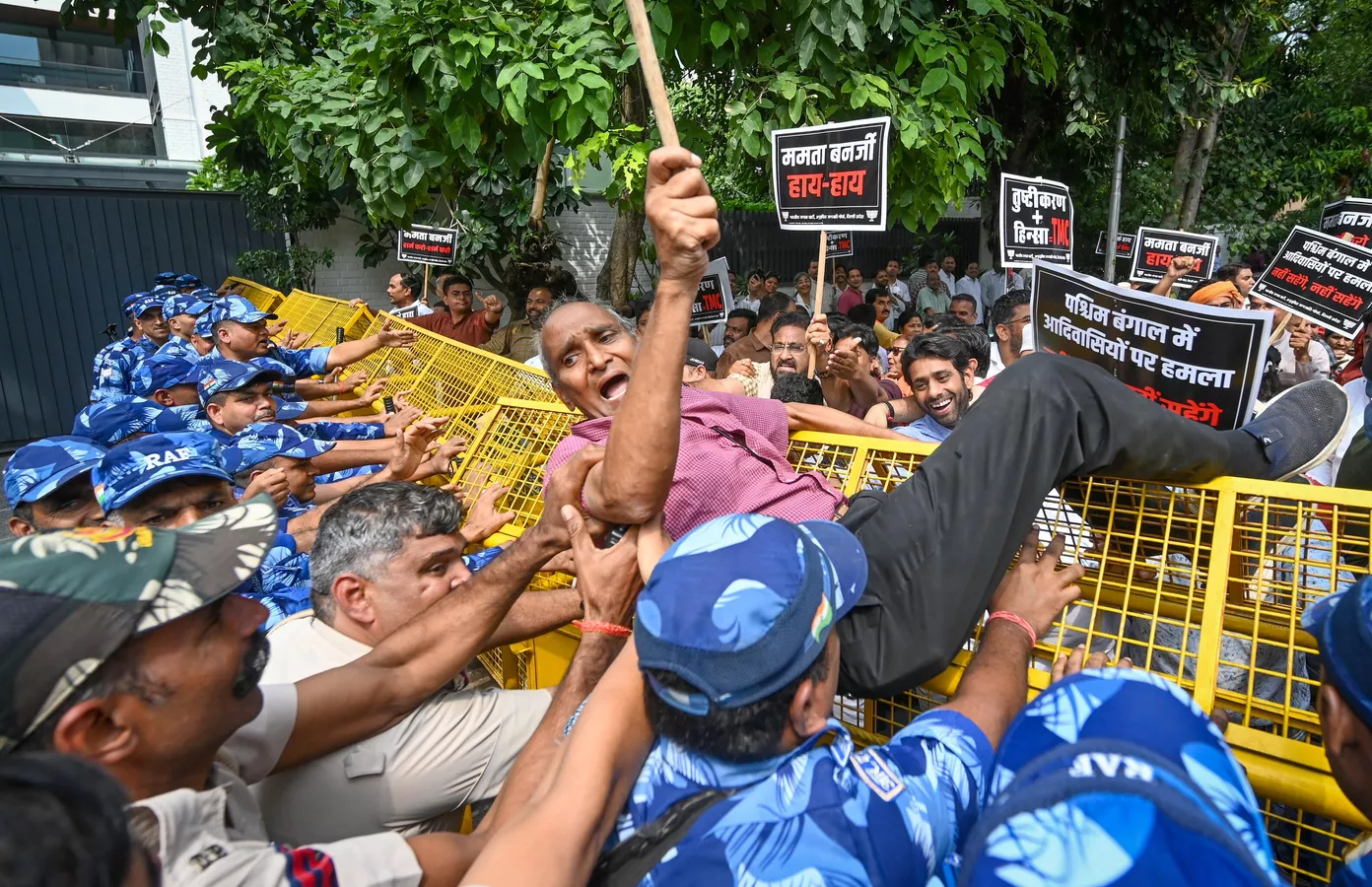 خلال تظاهر أنصار حزب "بهاراتيا جاناتا" من إس. تي. مورتشا، ضد رئيسة وزراء ولاية البنغال الغربية، ماماتا بانيرجي، بعد تقارير عن تعرض نائب عن الحزب لاعتداء في ولاية البنغال الغربية في الهند