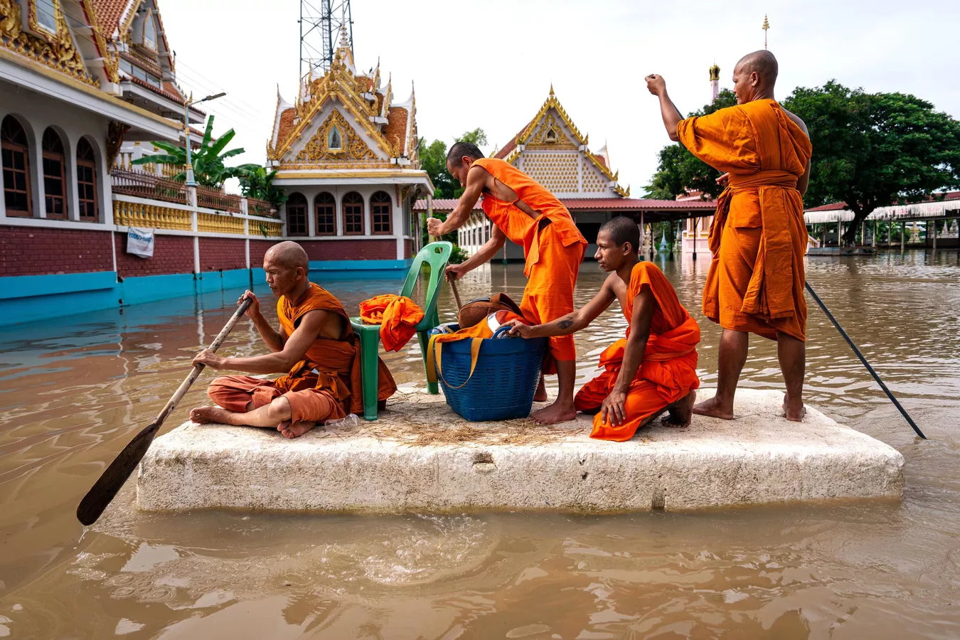 راهب يجوب مجمع معبد "وات كاي تيا" في تايلاند، الذي غمرته المياه في منطقة سام كوك، مقاطعة باثوم ثاني، مستخدمًا لوحًا إسفنجيًا كبيرًا كطوف مؤقت لجمع الصدقات
